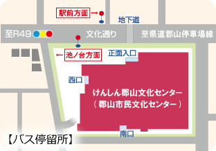 ※郡山駅前バス乗り場「郡山駅前11番ポール」より 「市民文化センター」下車 (※リンク先は、福島交通のウェブサイト)